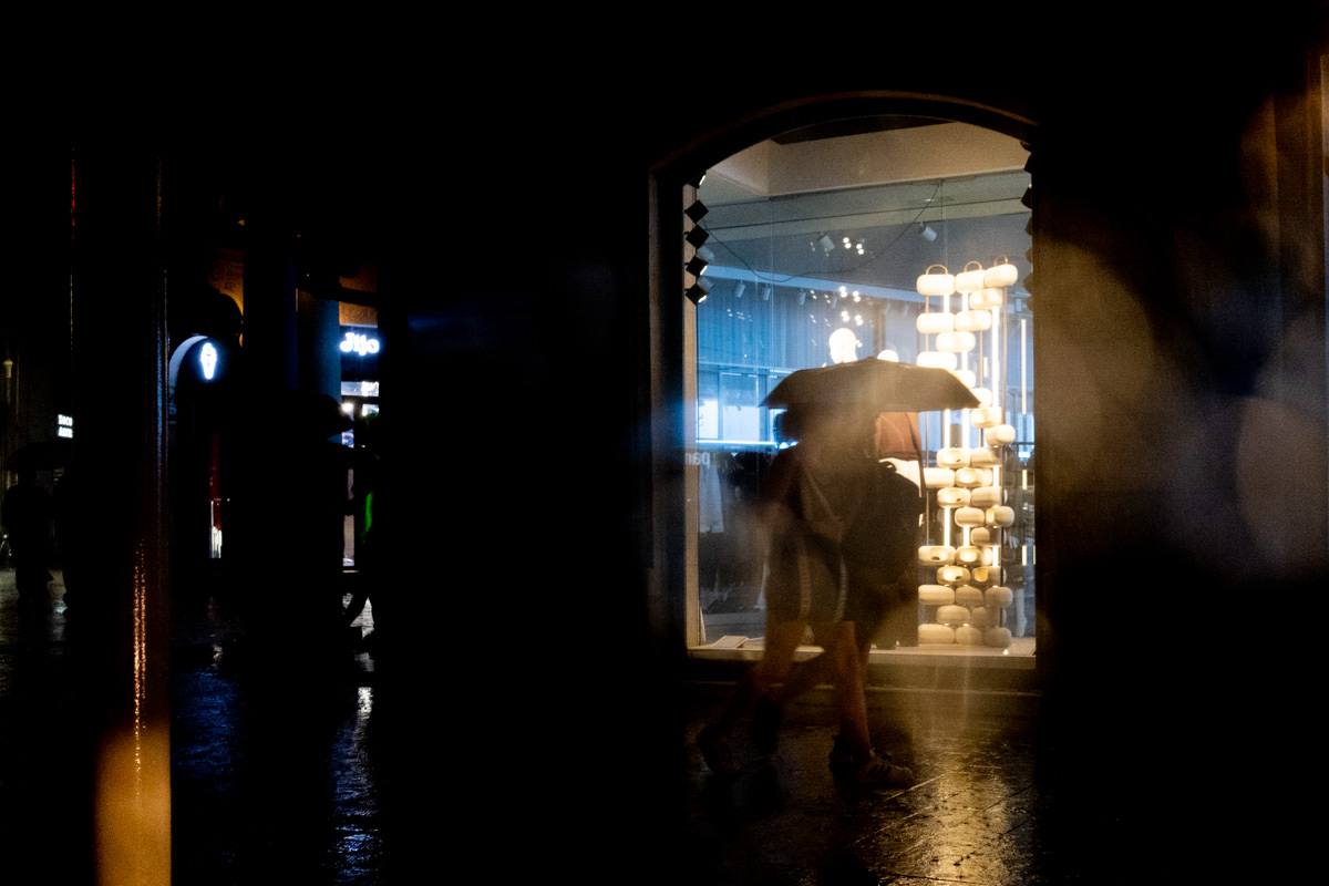 A mix of umbrellas and colorful plastic ponchos are filling the space disclosed by the door of La Virreina Centre de la Imatge. It’s like witnessing a waltz of colorful ghosts floating in the darkness.
