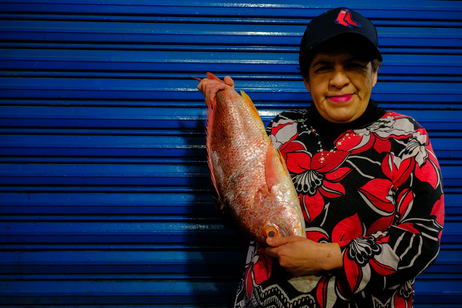 I take the chance to take a couple of portraits. I love that as soon as I ask if I can photograph her she grabs a big red fish. Perfect combination with the intense blue shutters of the nearby stand.