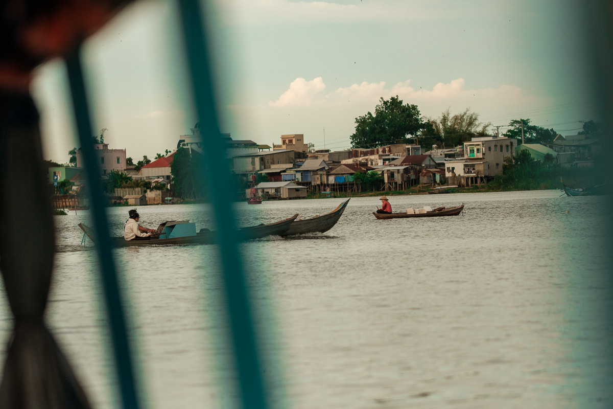Very few fishing boats are out, which clashes with my expectations of seeing fishermen returning home. But I still enjoy the ride, especially when we stop by a rice field and the guy explains that we’re exactly one rice field away from Cambodia.