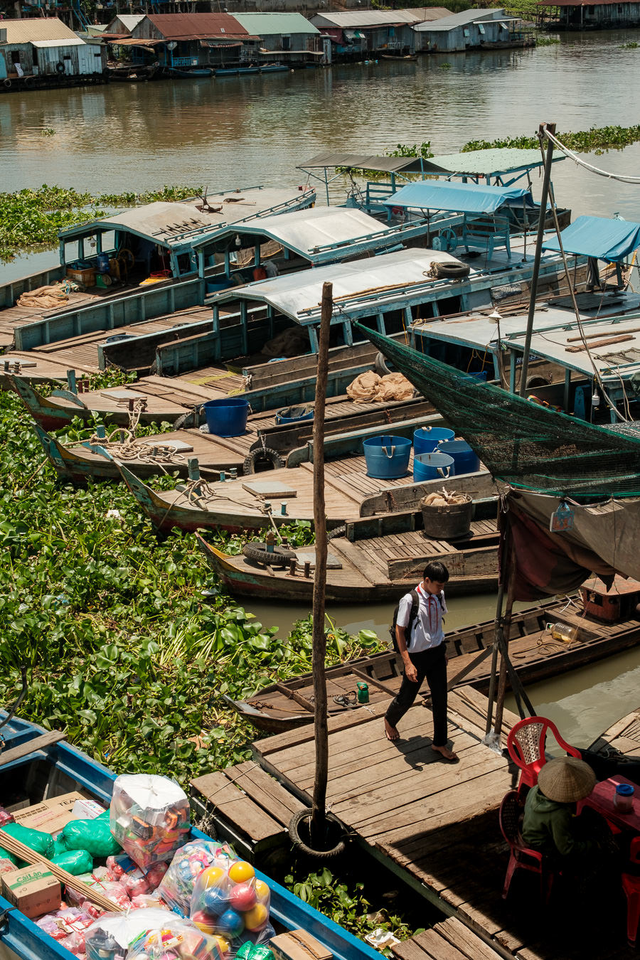 I get a local boat to take me around the river and show me life along the canals. What unfolds in front of my eyes is a patchwork of metal sheets, bricks, and wood—floating on the river or stacked on top of concrete stilts that lift people’s lives just a few meters above the water.