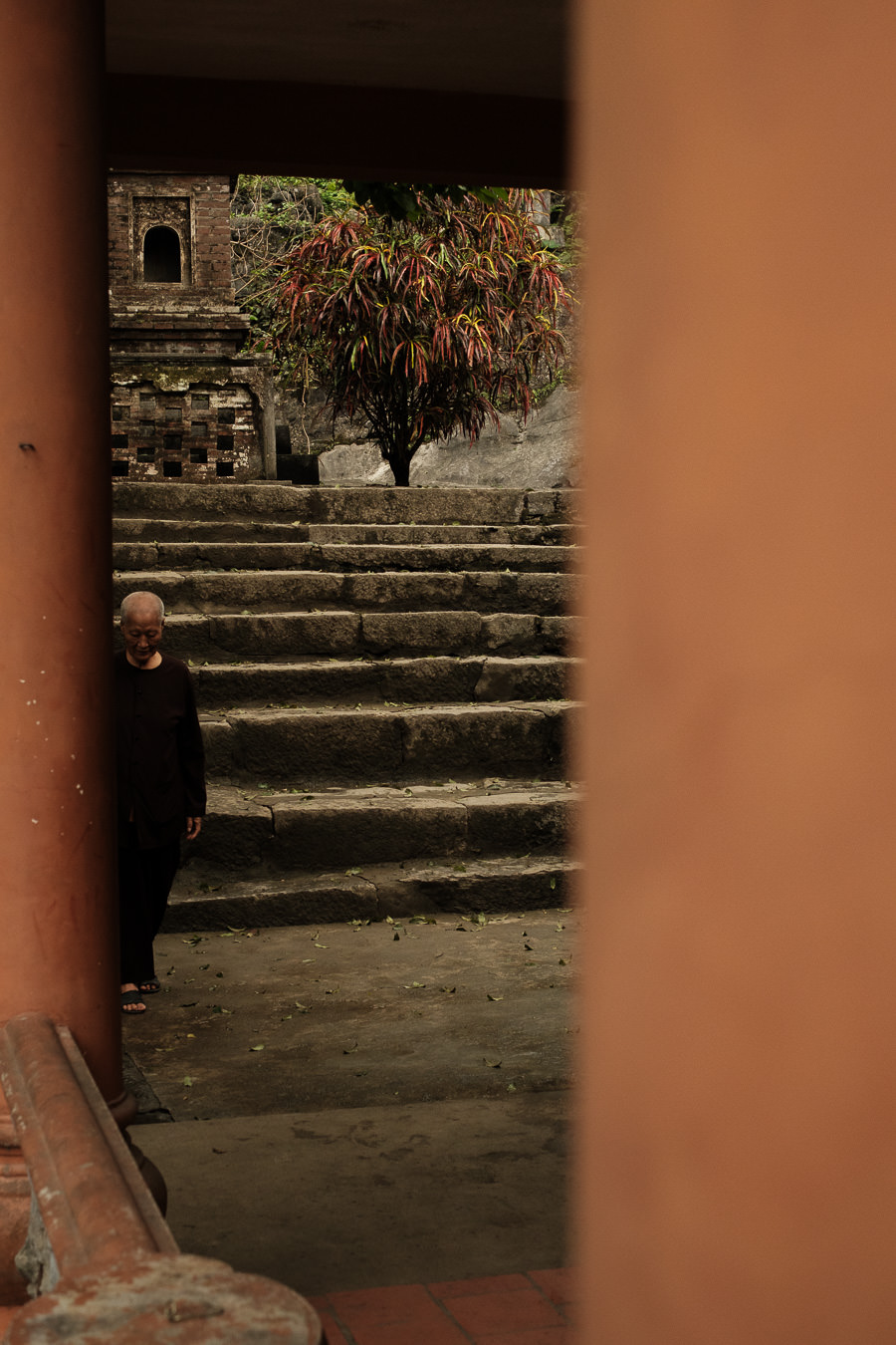 After a while, I decide to move on with the goal of catching some golden hour light at the Bích Động Pagoda. As suggested by my AI fixer, after 16:30 the place starts to empty out, and even if it officially closes, it’s still possible to linger and witness a glimpse of monastic life. At the end of the day, photography is a matter of patience. I had a tourist photobomb a nice composition with a monk walking down the stairs, so I decided to wait for another chance—something that happens once has a good chance of happening again. Luckily, fortune rewards patience.