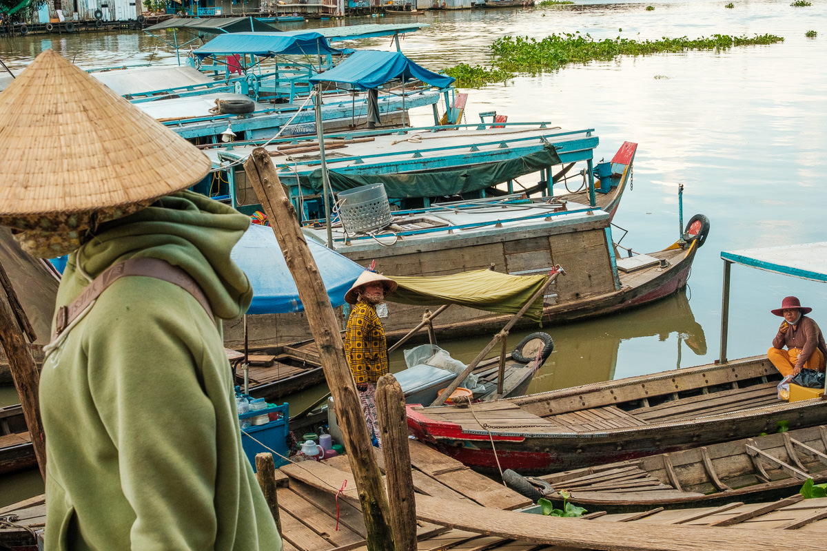 Markets change in shape and location, but they share the same vibe. The first thing I do in a new place is wander around a market. In this case, Châu Đốc has a central market that stretches from the interior out to the riverside. Here, people hop on small boats to reach the other side.