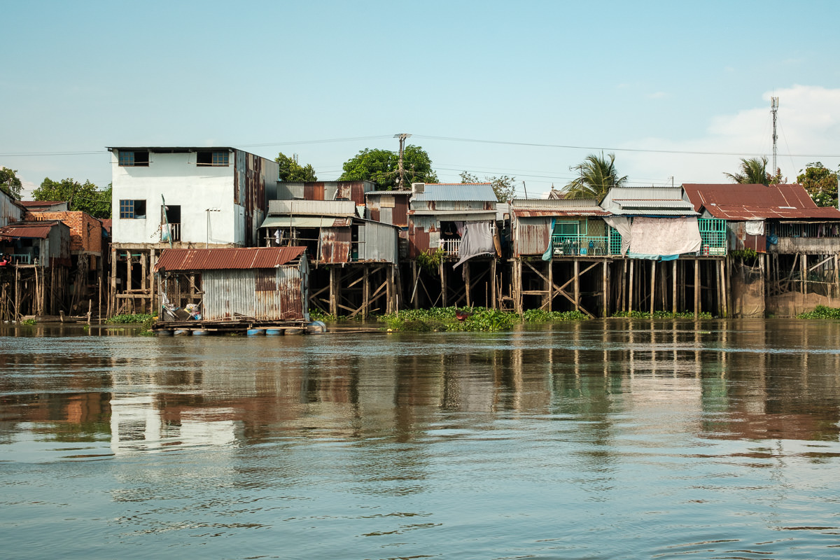 I get a local boat to take me around the river and show me life along the canals. What unfolds in front of my eyes is a patchwork of metal sheets, bricks, and wood—floating on the river or stacked on top of concrete stilts that lift people’s lives just a few meters above the water.